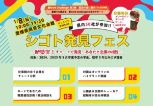 2023年1月8日(日)に開催予定の「シゴト発見フェス~新感覚!チャートで発見 あなたと企業の相性~」へ参加します。